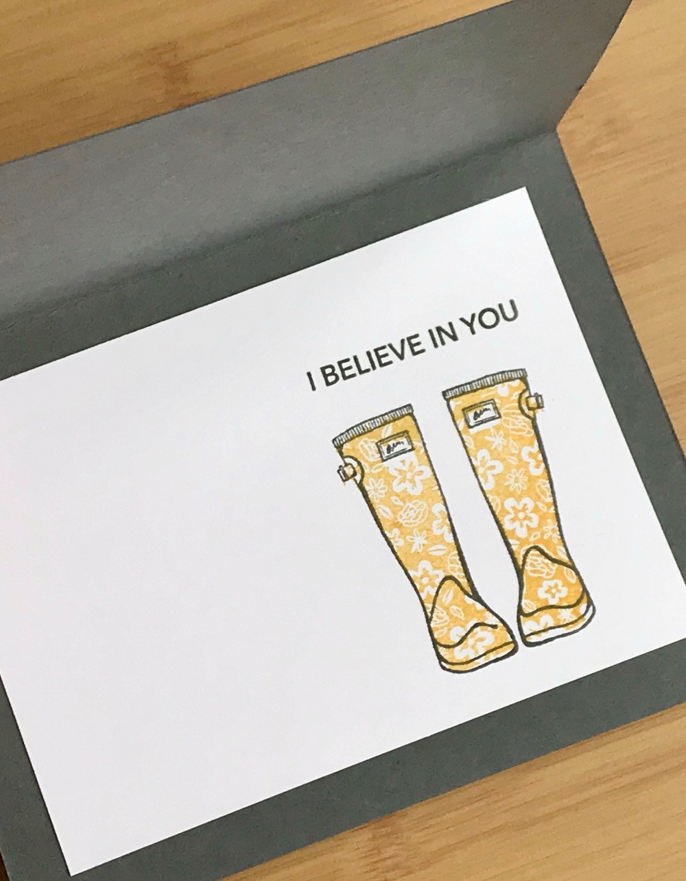 When I designed this card, I stamped the clouds on the notecard and added the rain on the card front. I thought maybe the clouds were too "heavy" and not the right proportion for the boots, so I switched them when I stamped it during my video. I can't decide. Which way do you like it best? Leave me a comment and let me know!
